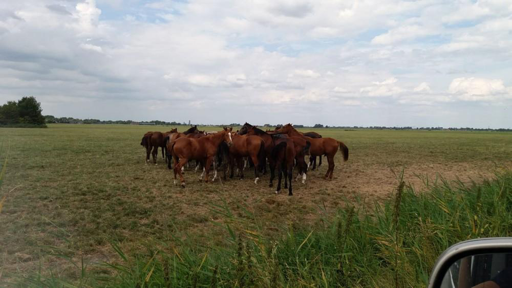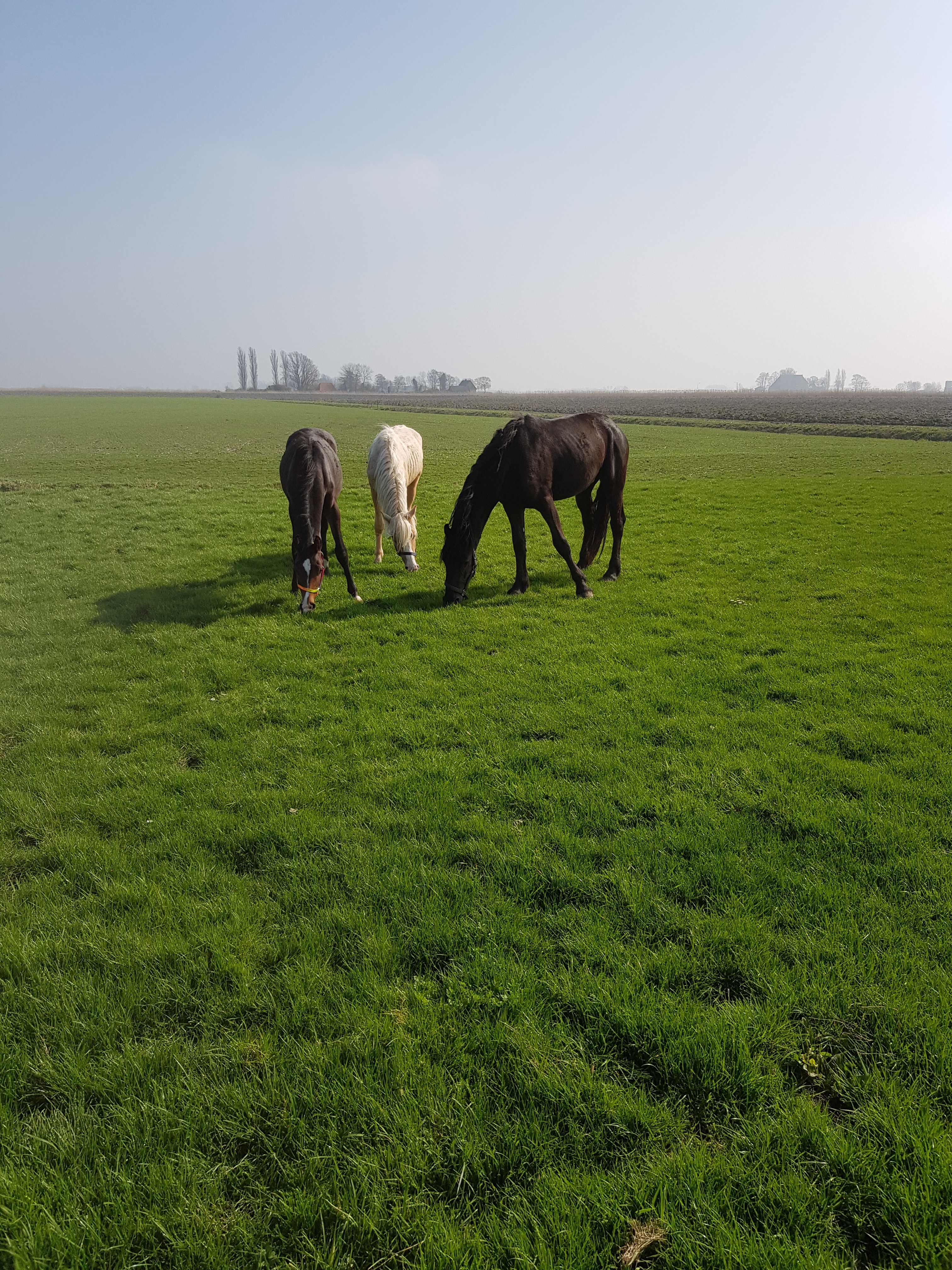 In het zomerseizoen staan de paarden 24/7 in het land. Het land ligt rondom de boerderij waar door er altijd toezicht is. En de paarden worden dagelijks bezocht. De paarden worden regelmatig omgeweid. Ivm wisselteelt op het bedrijf gaat het altijd om jonge weides met een goede graskwaliteit. De beste afrastering is géén afrastering. Daarom gebruiken we ook zo weinig mogelijk koord ( schrikdraad ). We hebben brede sloten, met doorlopend water. Ze kunnen uit een waterbak drinken die zichzelf bijvult, er is dus altijd vers water beschikbaar.
