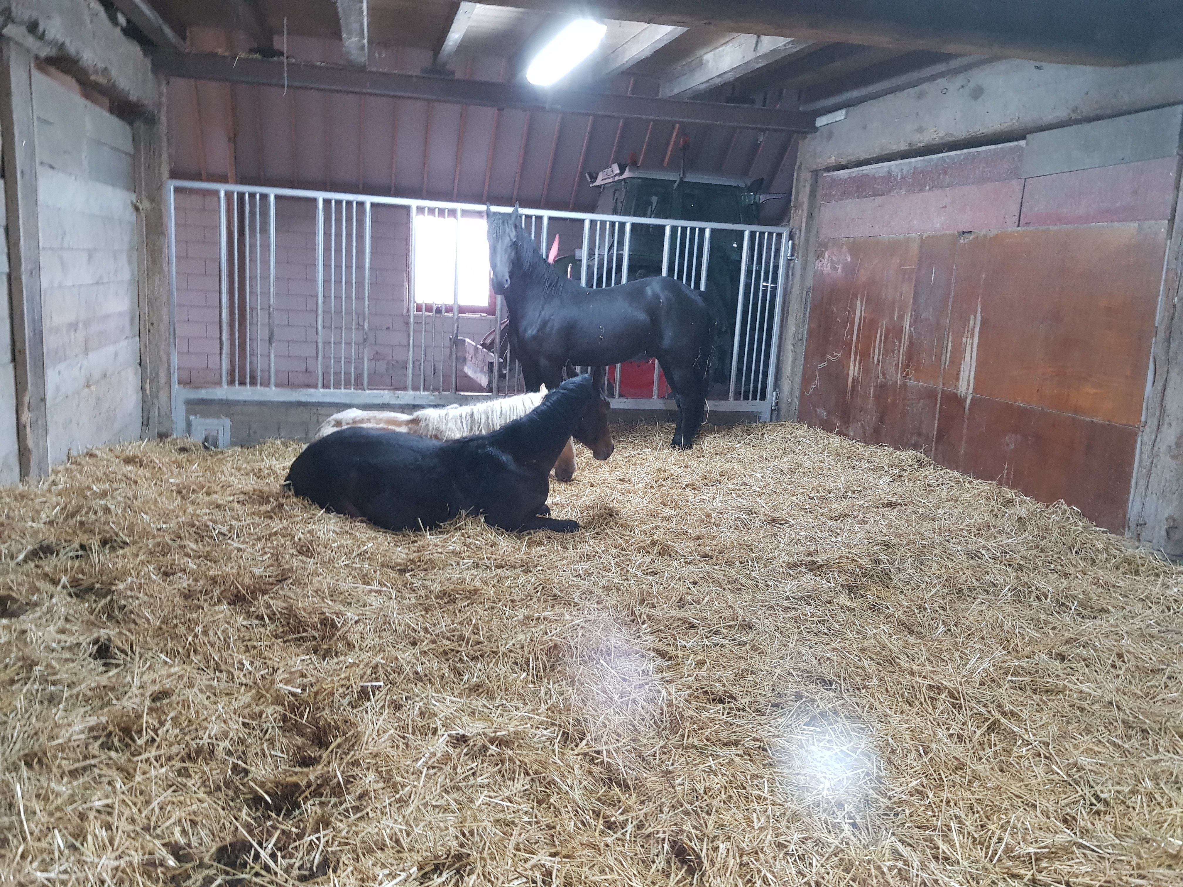 In het winterseizoen, 1 oktober tot 1 mei, staan de paarden in groepsboxen, zodat ze voldoende ruimte hebben om te bewegen. De paarden gaan indien de weersomstandigheden dit toelaten in groepsverband een paar keer per week naar buiten. In de stal is onbeperkt kuilgras van hoge kwaliteit aanwezig. Dit kuilgras wordt zelf gewonnen van eigen land. Ivm wisselteelt gaat het altijd om jong en vers grasland , met een op maat gebruik van kunstmest. In de boxen strooien we stro dat ook van eigen land komt.